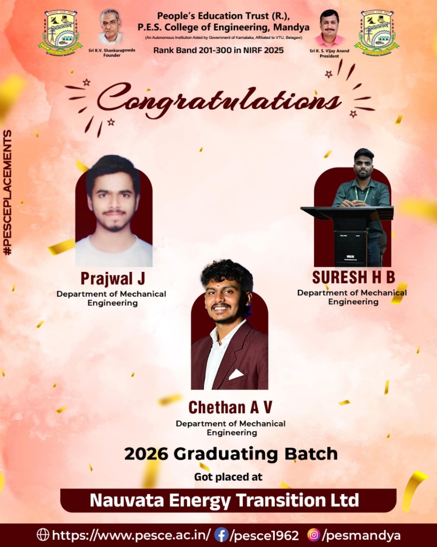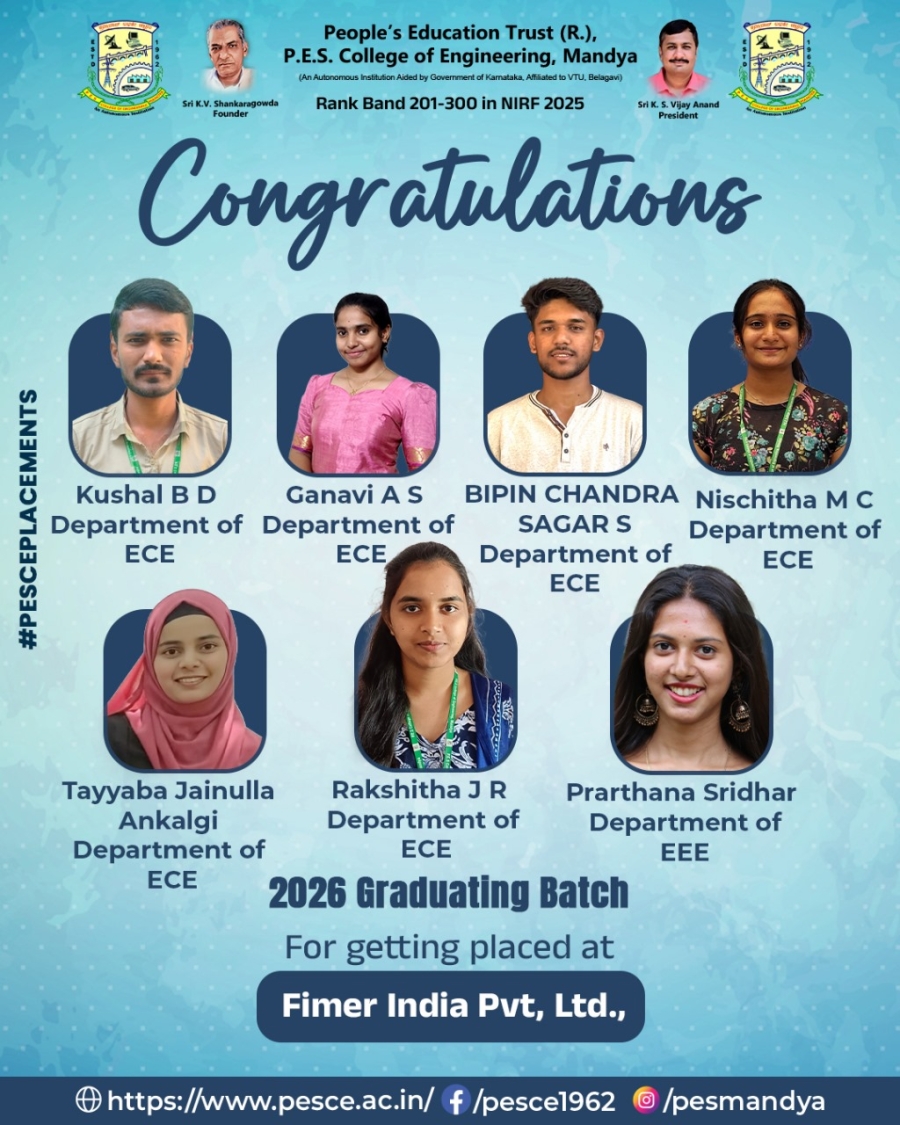 "I am very fortunate to write my experience in PESCE,From the starting day to the last day of my college PESCE has made all my days memorable,Right from diversity to academic excellence PESCE has it all,at last my special thanks to the teachers who have always been the support system for all the students,thank you PESCE for making the future bright of all the students who been part of PESCE....!".