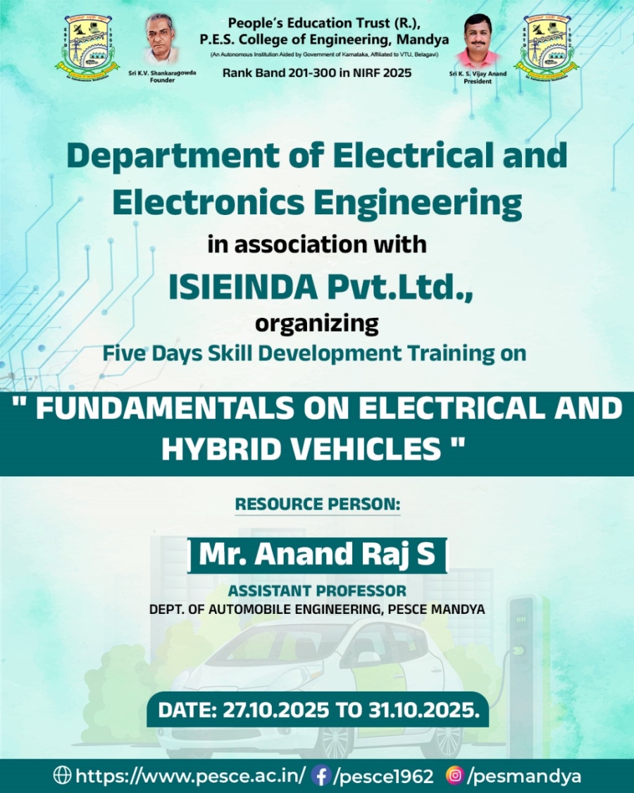 The Department of Electrical and Electronics Engineering was established right from the inception of the institute in the year 1962. Established with a vision to produce competent and skilled engineers, the department offers undergraduate and research programs. Electrical & Electronics Engineering Programme has been accredited by NBA for 3 years (2023-24 to 2026-27)
